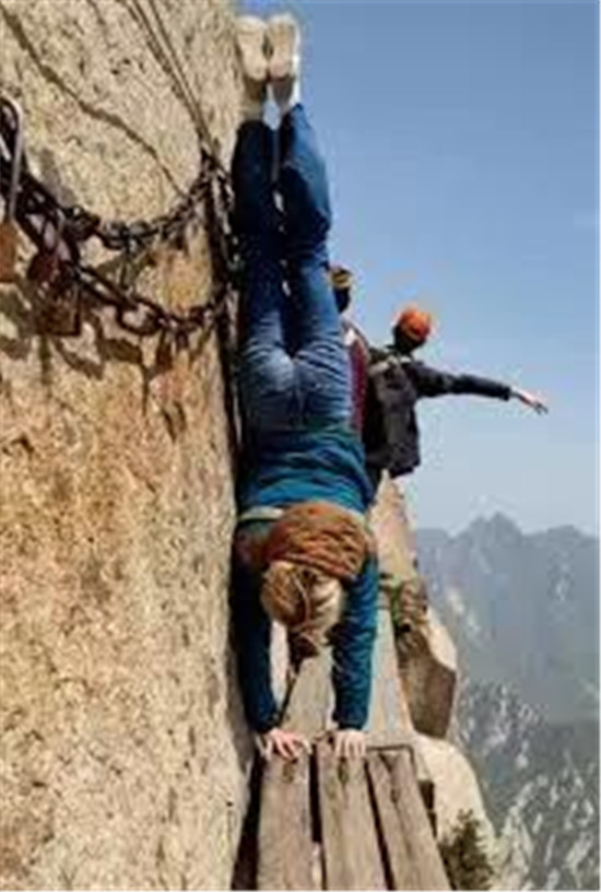 譯:這些令人暈眩的照片,拍的是中國陜西省一座旅游名山的游客正在通過建在峭壁上的極其狹窄且危險的棧道。