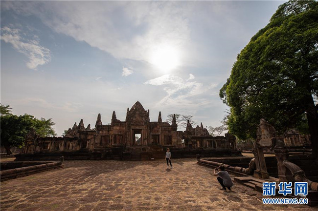 4月5日,游客參觀泰國武里南府低城寺。 一年一度的“登帕儂隆山節(jié)”在泰國東北部毗鄰柬埔寨的武里南府帕儂隆山舉辦。當(dāng)?shù)厝艘怨叛b巡游展示獨(dú)特的傳統(tǒng)文化,希望能吸引更多外國游客、促進(jìn)當(dāng)?shù)芈糜螛I(yè)發(fā)展。 新華社記者 張可任 攝