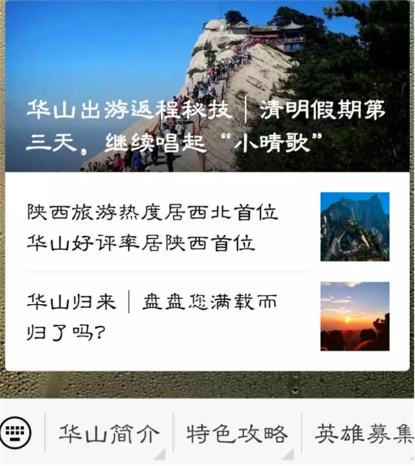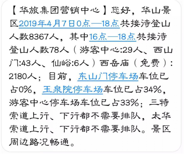 景區(qū)節(jié)日期間通過(guò)電子大屏、官方微博、微信、短信平臺(tái)向游客和各單位提供實(shí)時(shí)登山排隊(duì)人數(shù)、車位、天氣等信息。(小長(zhǎng)假期間新浪微博共計(jì)發(fā)送微博48條,網(wǎng)友留言及回復(fù)361條,閱讀量共計(jì)421446余次;微信公眾平臺(tái)共計(jì)發(fā)送18篇軟文報(bào)道,分享及轉(zhuǎn)發(fā)量共計(jì)1098次,閱讀量共計(jì)10272次;短信平臺(tái)共計(jì)發(fā)送2394條短信,及時(shí)匯報(bào)各項(xiàng)旅游信息)。
