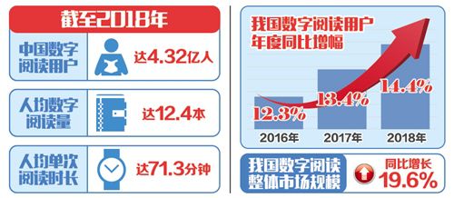 4月12日至14日,第五屆中國(guó)數(shù)字閱讀大會(huì)在杭州召開(kāi)。會(huì)上發(fā)布的《2018年度中國(guó)數(shù)字閱讀白皮書(shū)》顯示,截至2018年,中國(guó)數(shù)字閱讀用戶總量達(dá)到4.32億,人均數(shù)字閱讀量達(dá)到12.4本,人均單次閱讀時(shí)長(zhǎng)達(dá)71.3分鐘。我國(guó)數(shù)字閱讀整體市場(chǎng)規(guī)模已達(dá)到254.5億元,同比增長(zhǎng)19.6%,大眾閱讀市場(chǎng)規(guī)模占比逾九成,是產(chǎn)業(yè)發(fā)展主導(dǎo)力量。