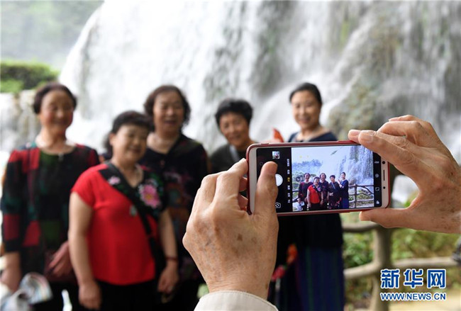4月17日,游客在大新縣德天瀑布景區(qū)游覽拍照。