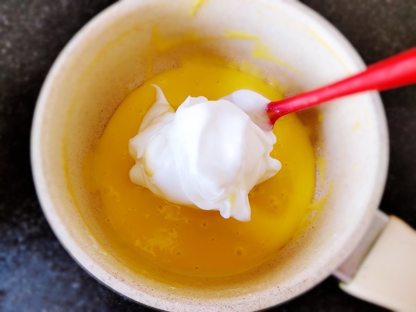 8.拌勻后,倒回蛋白霜之內(nèi),繼續(xù)上下翻拌均勻。