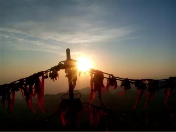 華山是一座愛情的殿堂,華山上的愛情故事悲烈、凄美而感人。我們曾經(jīng)為世界上許許多多的愛情故事所感動。其實,發(fā)生在華山上的愛情故事一樣讓人的心情無法平靜。眾所周知的神話傳說《寶蓮燈》中,三圣母為了愛情,被二郎神巨石壓在華山頂上;弄玉為了愛情,逃離安逸的生活,與蕭史雙雙來到華山,琴瑟合鳴;漢臣王咸不畏艱險,到華山尋找賢妻南陽公主等等這些愛情故事,感天動地,流傳不衰,不知讓多少人為之贊嘆。也許是讓華山上這些動人的愛情故事所感染,不知從什么時候開始,在代表著堅實連接的一串串鐵鏈上,游人掛上了閃閃的金鎖,把矢志不渝的愛情鎖在華山上,在華山的見證下,祝愿自己的愛情如同華山一樣永遠不會改變。