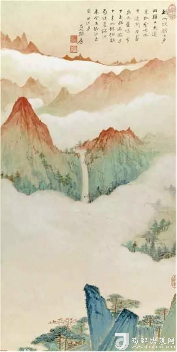 《華山云海》這幅山水畫是由中國著名山水畫家張大千先生創(chuàng)作,該幅山水畫作品圖也是畫家作品當中出類撥萃的的精品之一,描繪了華山旭日東升的云海。