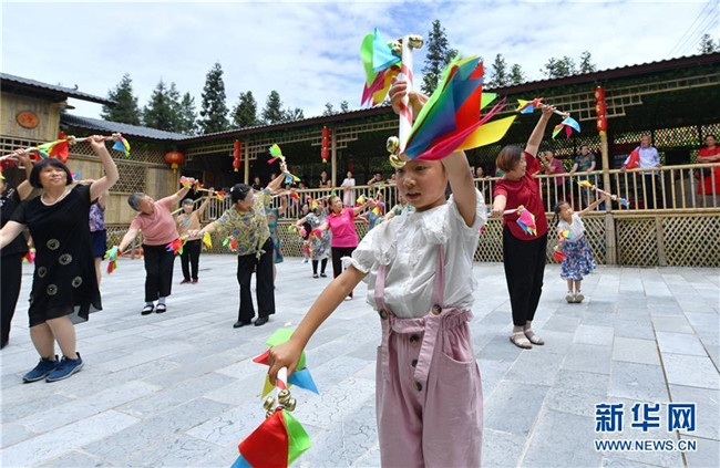 7月1日,游客在湖北省恩施土家族苗族自治州宣恩縣珠山鎮(zhèn)車洞坪民宿旅游區(qū)體驗土家族“八寶銅鈴舞”。 新華社發(fā)(宋文 攝)