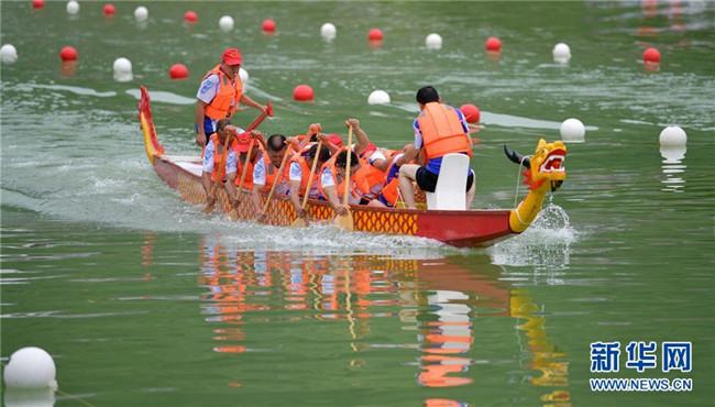 6月30日,龍舟隊在湖北恩施龍馬風(fēng)情小鎮(zhèn)進(jìn)行比賽。新華社發(fā)(楊順丕 攝)