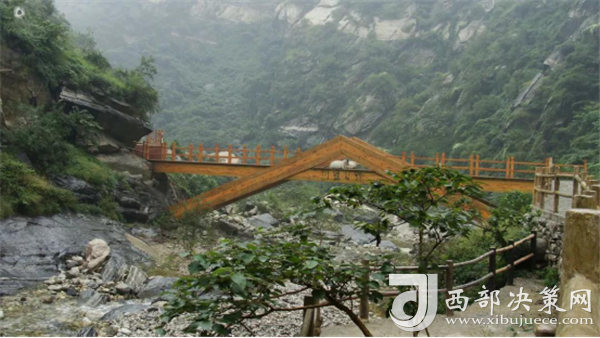 踏進(jìn)峪口,頭頂是遮天蔽日的綠色,四周水聲潺潺,鳥鳴悅耳,空谷幽靈,沉靜自然,涼爽的山風(fēng)夾雜著花草的芳香,瞬間就滋潤了燥熱的心情。迎著溪谷逆水而上,山的奇特與水的靈秀交織在一起,伴著水聲,綿延著向更遠(yuǎn)處伸展。若有情致,卷起褲腿,或穿上沙灘鞋,或赤足,踏著被溪水長久沖刷平整光滑的大石頭,任由清涼通透的溪水撫摸雙足,沁心入骨,仿佛拾回了童年的歡樂,煩擾憂愁全無蹤影。臨水而筑的棧道,全程依水而行,曲徑通幽,每轉(zhuǎn)一道彎,都是一幅新景。