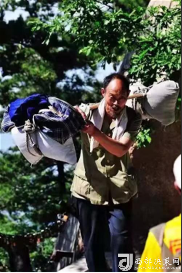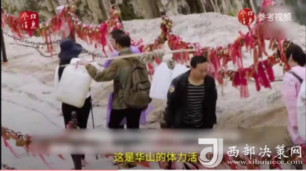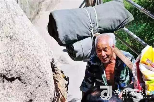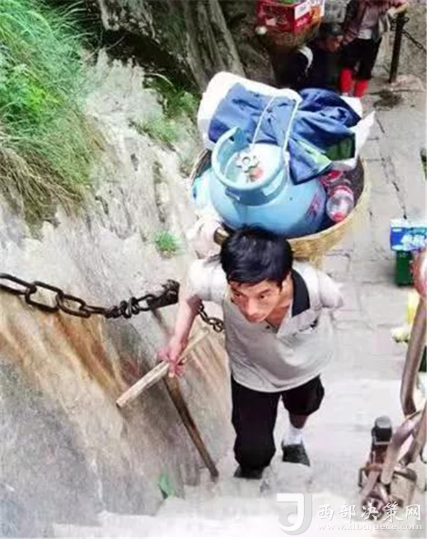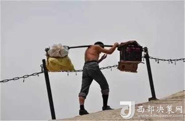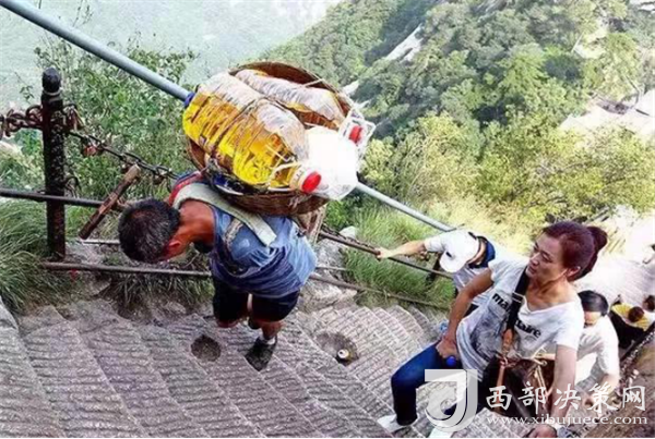 一位挑山工說:挑夫這個苦力活,已經(jīng)沒有年輕人來做。如今35歲以下的年輕人,對這個活瞧不上眼,寧可閑著,也不做挑夫。但是,華山景區(qū)的正常運(yùn)營及后期建設(shè),必須依賴于挑夫。這活兒,總得有人做。
