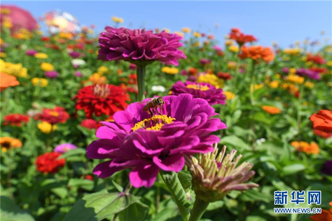 9月4日,在長(zhǎng)春市蓮花山生態(tài)旅游度假區(qū)花田,蜜蜂在花間采蜜。