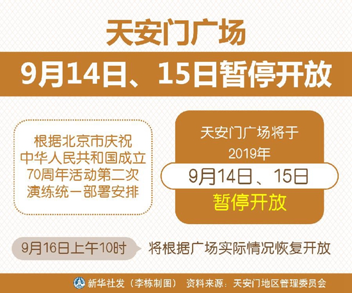 記者從天安門地區(qū)管理委員會獲悉,根據(jù)北京市慶祝中華人民共和國成立70周年活動第二次演練統(tǒng)一部署安排,天安門廣場將于2019年9月14日、15日暫停開放。9月16日上午10時,將根據(jù)廣場實際情況恢復開放。(記者魯暢)