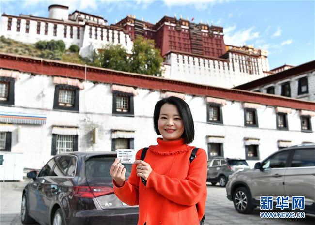 10月15日,從西寧來的游客張書培展示她用身份證換取的布達拉宮散客免費預約券。