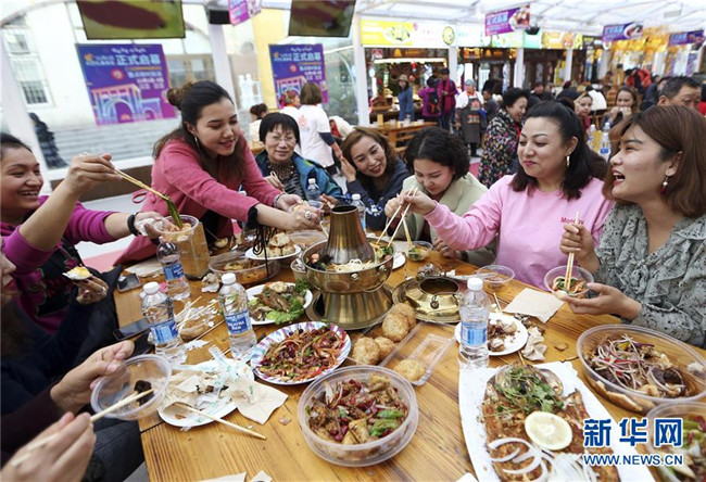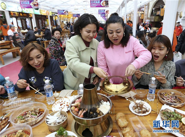 11月2日,游客在大巴扎冰屋美食街品嘗免費美食。