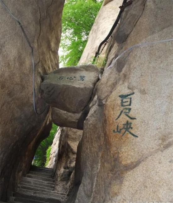 又叫“百丈崖”,兩壁欲合,卻被飛來的兩顆石塊從中撐開,分別為“驚心石”和“平心石”。人從石頭下鉆過,膽戰(zhàn)心驚又安然無恙,驚險刺激。