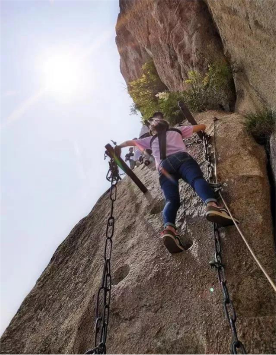 在萬仞絕壁上鑲嵌石釘搭木椽而筑,棧道上下皆是懸崖絕壁,鐵索橫懸,游人至此,面壁貼腹,屏氣挪步,被譽為“華山第一天險”。