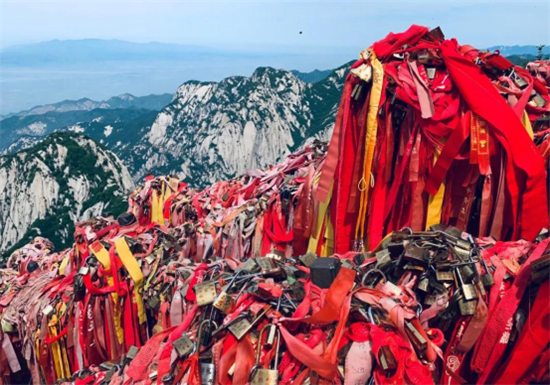 關(guān)內(nèi)關(guān)外登山路兩側(cè)鐵索上情侶鎖、平安鎖,重重疊疊,紅繩彩線迎風搖曳,寄托了大家種種情思和愿望,形成了獨特的鎖文化。