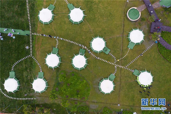 5月31日,空中俯瞰石淙花海內(nèi)的帳篷露營區(qū)(無人機照片)。新華社記者 徐昱 攝