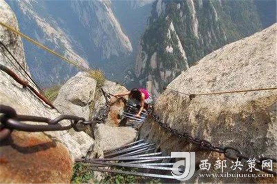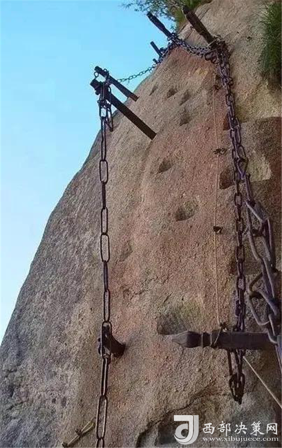 華山還有一處常人不敢涉足的險境--- 鷂子翻身。鷂子翻身在華山東峰是通往下棋亭的必由之路。其路鑿于懸崖上,下視唯見寒索垂于凌空,不見路徑。游人至此,需面壁挽索,以腳尖探尋石窩,交替而下,其中幾步需如鷹鷂一般、左右翻轉(zhuǎn)身體才可通過。此景只留英雄客,婦孺難聞幾聲咳。這句話現(xiàn)在也未然,巾幗不讓須眉,以后應(yīng)是往來無懼者,皆是英雄客了。