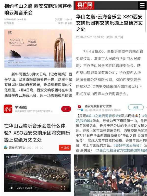 本場(chǎng)華山之巔·云海音樂會(huì)通過央視新聞、央視頻、央視音樂、B站、中新網(wǎng)、人民視頻、愛奇藝隨刻、愛滿地古典音樂頻道、西安發(fā)布、西安臺(tái)、華商網(wǎng)、西部網(wǎng)、咪咕音樂、焦糖、西影視頻等平臺(tái)進(jìn)行了同步播放。全網(wǎng)首輪播放量5千萬+。