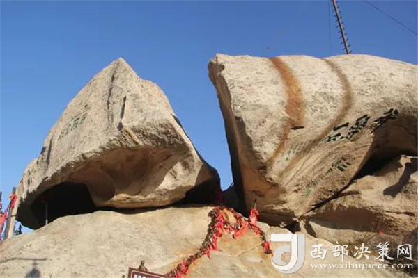 來到北峰,不可不提的自然是華山論劍了,在峰頂有一塊石牌,上面是金庸先生親筆題寫的“華山論劍”,此處也成為游客登臨華山必到之處。