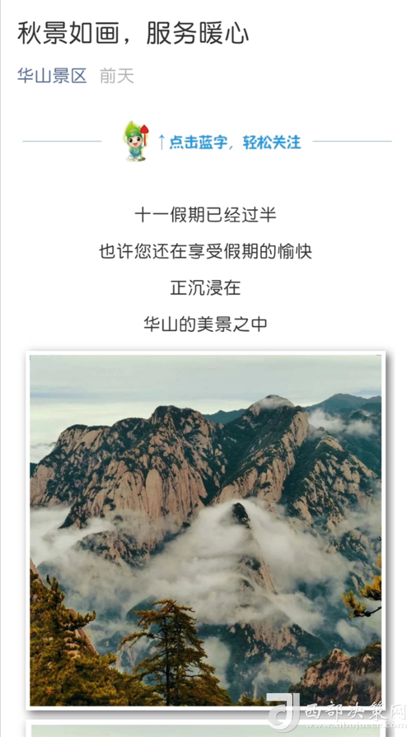 9月30日至10月8日期間,景區(qū)官方微信以歡度雙節(jié)、防疫安全、熱心服務、旅游攻略等為主題發(fā)布宣傳軟文23篇,累計閱讀量4.2萬人次,分享及轉發(fā)量共計1430次;官方微博向游客及時發(fā)布景區(qū)天氣、客流、景色實況、溫馨提示等景區(qū)度節(jié)綜合信息共計102條,閱讀量高達101.9萬次,并耐心、細致解答網友私信、評論共計532條;通過抖音平臺發(fā)布景區(qū)公告、秋日美景、好人好事等短視頻及圖片錦集共計18條,播放量共計 1.4萬次。
