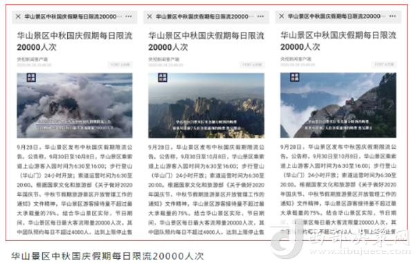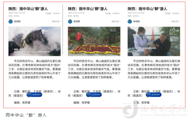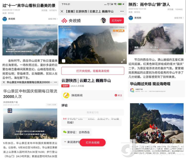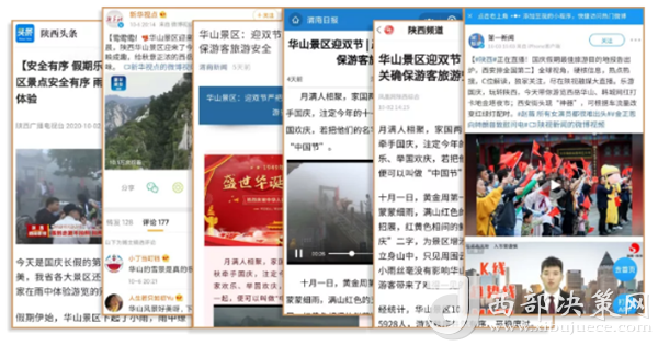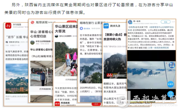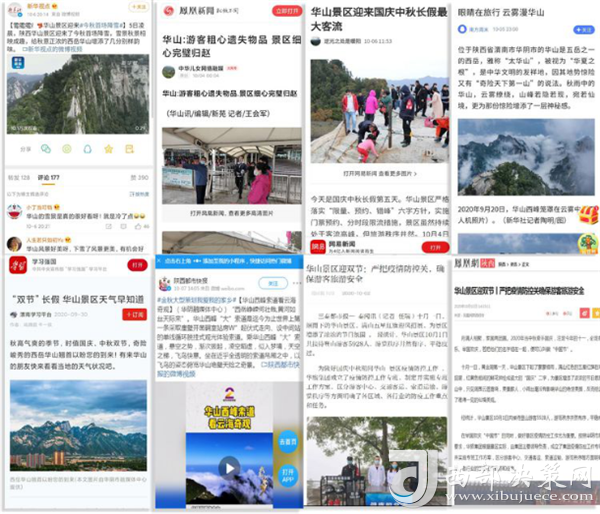 度節(jié)期間,通過央視cctv2【天下財經】、cctv4、cctv13【新聞30分】、cctv13【新聞直播間】、央視網【國慶假期·出游】、央視網學習強國、央視新聞客戶端、新華社等國家級媒體對景區(qū)度節(jié)工作、游覽秩序、特色服務等方面進行轟炸式報道;聯(lián)合陜西日報、陜西電視臺、渭南日報、渭南電視臺、三秦都市報、陜西旅游資訊、騰訊網、新浪網、網易陜西、鳳凰陜西等30余家主流媒體對景區(qū)度節(jié)期間各項工作及實時風景進行跟蹤報道,共計發(fā)布各類宣傳稿件239篇,全面提升景區(qū)旅游熱度。