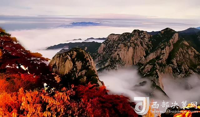 就在這秋日落葉紛飛的季節(jié),華山卻用五顏六色裝扮了起來,紅葉滿山,山崖為底,松檜為墨,一抹絢爛令人心顫,秋風(fēng)好比一支神奇的彩筆肆意揮灑,將華山繪就成了一幅燦爛的畫卷,從山腳下的郁郁蔥蔥到山頂上的紅黃相間,華山上的每一個臺階都浸染在了火熱的絢爛中。