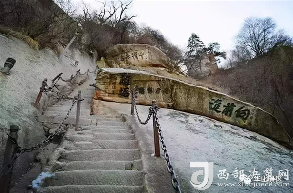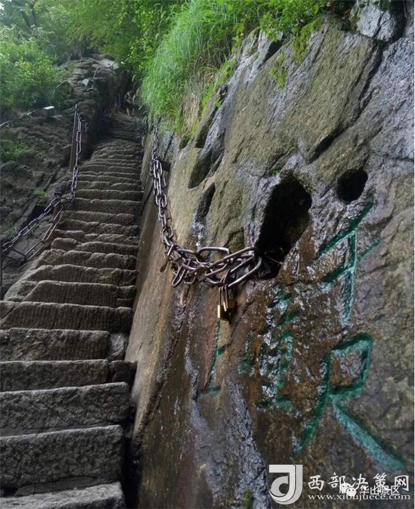 華山的登山之路蜿蜒曲折,到處都是懸崖絕壁。智取華山路開(kāi)辟之前,華山只有一條十分陡峭的道路可以通到山上,人們常用“自古華山一條道”的說(shuō)法來(lái)形容它的險(xiǎn)要。
