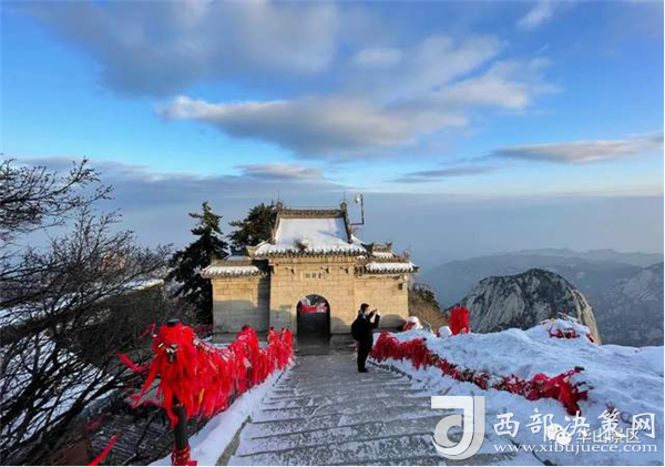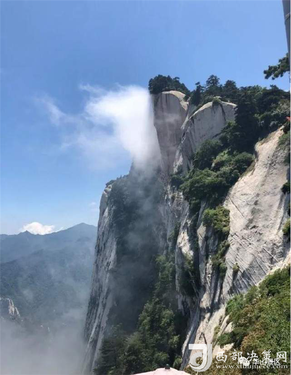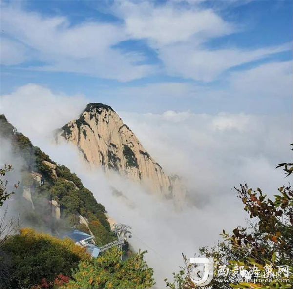 整個(gè)西峰為一塊渾然天成的巨石,北面臨空,懸崖絕壁如刀削鋸截,東西兩側(cè)狀如蓮花,因此也稱“蓮花峰”,這里更是“劈山救母”、“寶蓮燈”等傳說(shuō)故事的發(fā)生地。