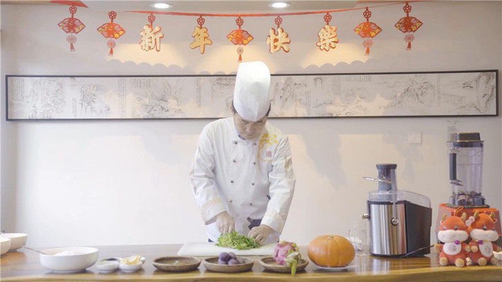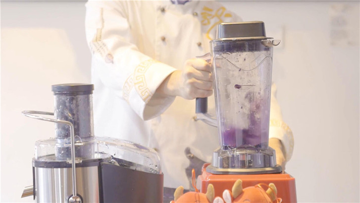 把切塊的蔬果依次放入榨汁機榨汁。