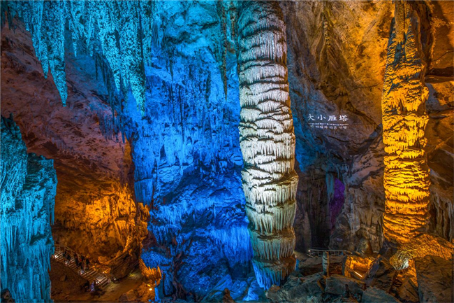 洞中金鑾寶殿、雷峰寶塔、玉柱擎天、玉林瓊花、犬牙晶花、千年之吻,動物王國、海底龍宮、巨幕飛瀑、石田珍珠、生命之源、珊瑚瑤池等景點形態(tài)迥異,光怪陸離,讓人不禁感嘆大千世界無奇不有,大自然造物之神奇。