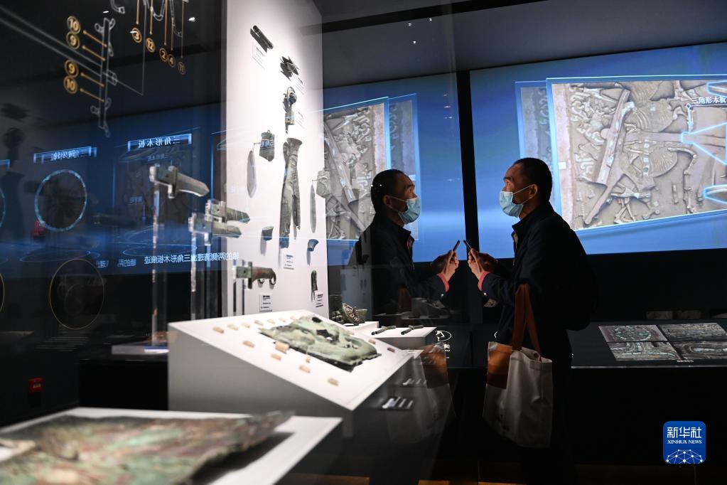 4月28日,游客在陜西考古博物館內(nèi)參觀寶雞周原遺址出土的銅輪牙馬車車飾。新華社記者 李一博 攝