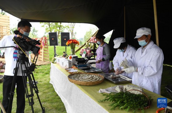 5月15日,肥西縣柿樹(shù)崗鄉(xiāng)村民通過(guò)“云上”直播制作當(dāng)?shù)孛朗齿镒郁昔?。新華社記者劉軍喜攝