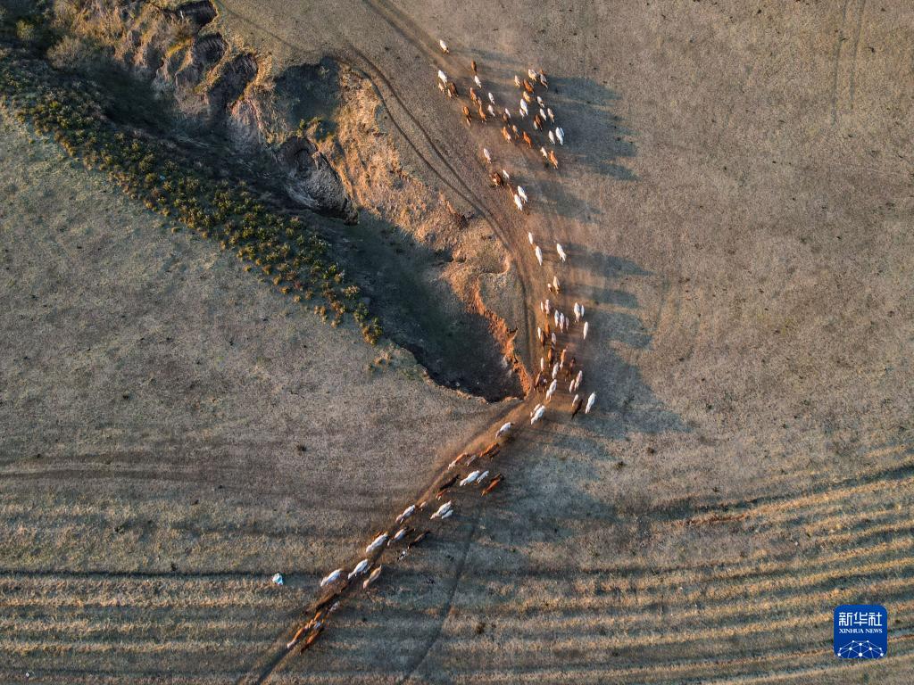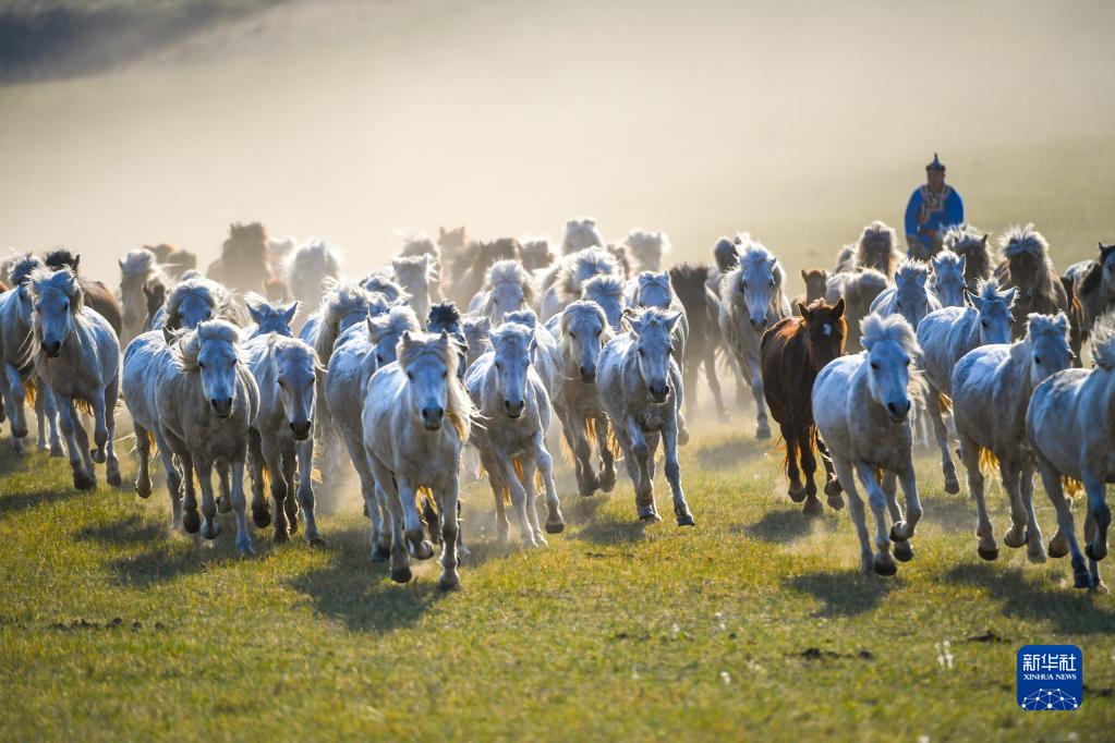 5月17日,錫林郭勒盟西烏珠穆沁旗的牧民在夕陽下馴馬。新華社記者 彭源 攝