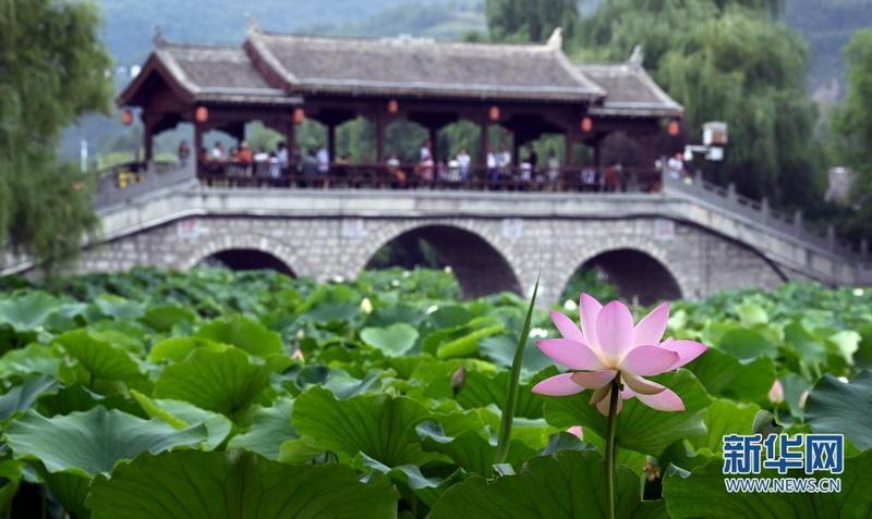 7月25日,游人在陜西省商洛市丹鳳縣棣花古鎮(zhèn)的風雨橋上觀賞荷花。