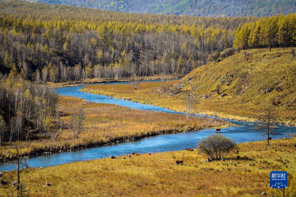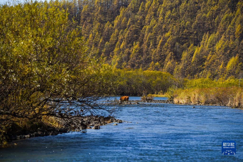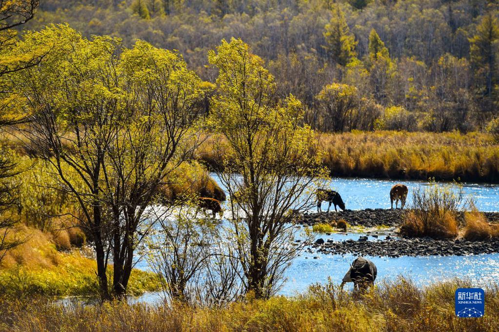 9月21日,牛群在阿爾山國(guó)家森林公園內(nèi)的河岸邊覓食。新華社記者 彭源 攝