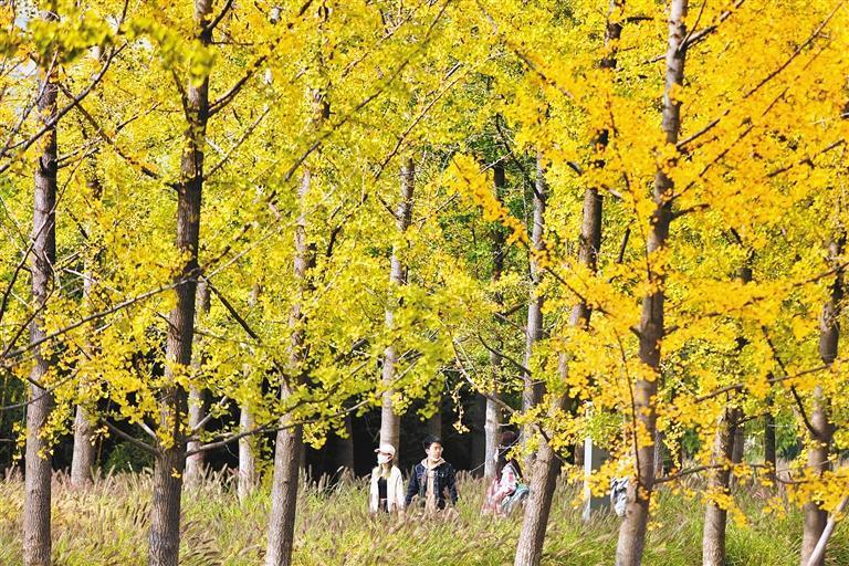 古城的秋韻,每一縷秋紅都寫滿了詩意,每一片橘黃都沾染了畫意。不同于春天的花紅柳綠,銀杏用“金黃”這一種色彩就可以將天地渲染到極致,觸目所及滿眼金色,置身其中,如同走進(jìn)童話世界一般美好愜意。