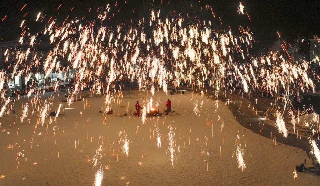 1月13日,民間藝人在河北省承德市興隆縣一景區(qū)為游客表演“打樹花”(無(wú)人機(jī)照片)。新華社發(fā)(劉滿倉(cāng) 攝)
